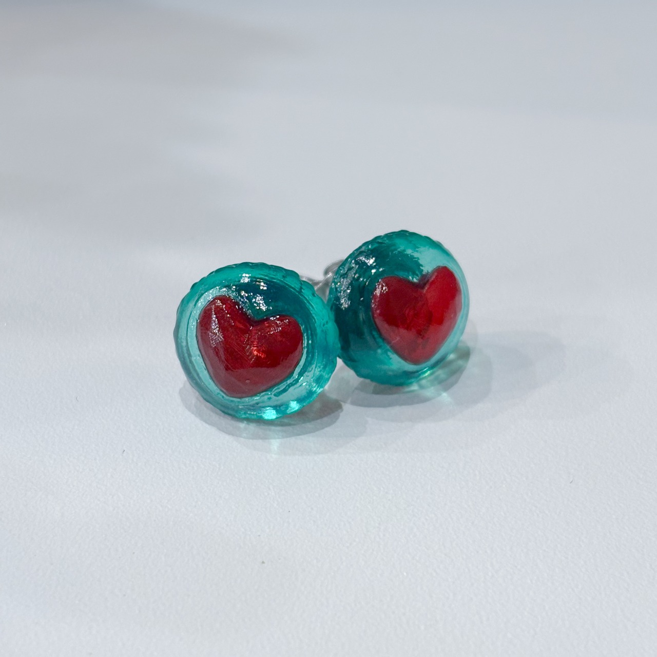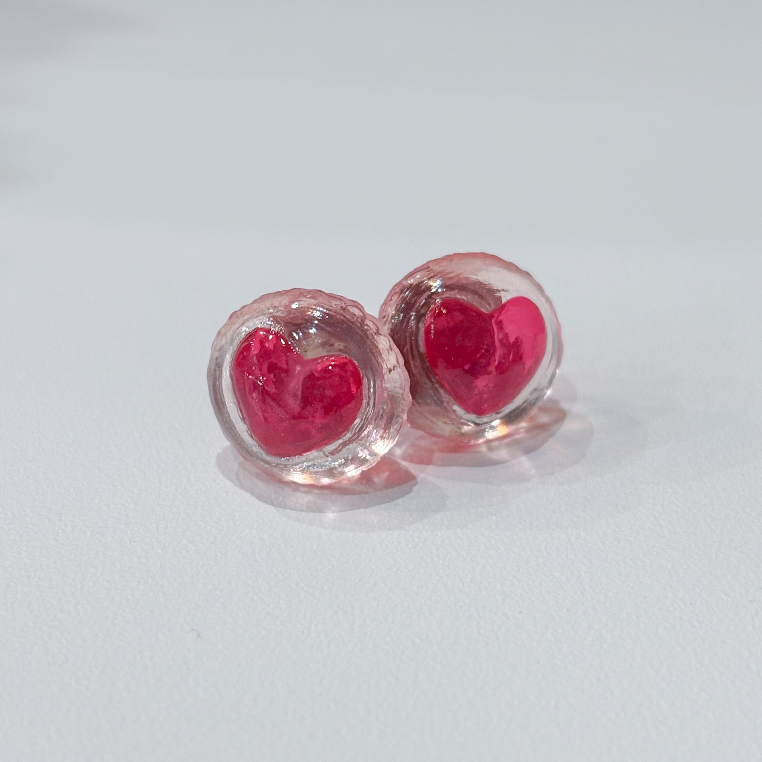 ハートのジュエリーをまあるい枕にぽとんと落としたようなピアス。